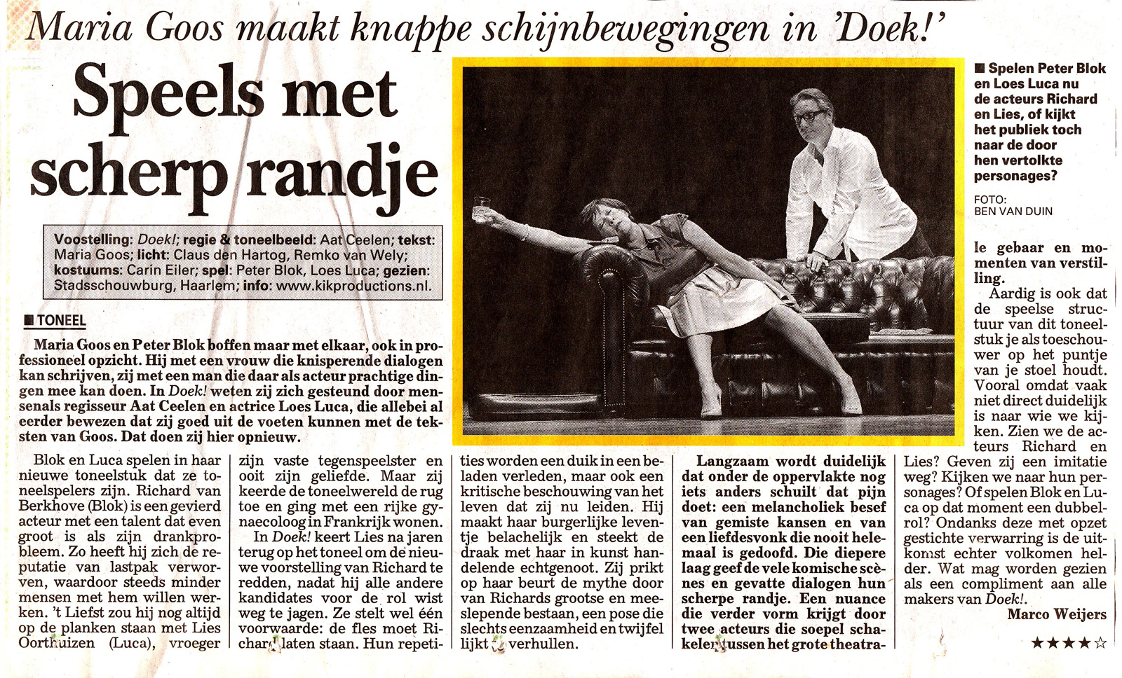 Twee acteurs, een bank en een tafeltje. Peter Blok en Loes Luca laten in het nieuwste stuk van Maria Goos zien dat je met weinig middelen een indrukwekkend spel kunt neerzetten. Memorie van beschadigde mensendoor Vincent KoutersMaria Goos schreef een vernuftige dialoog over twee acteurs die niet met, maar ook niet zonder elkaar kunnen. Een knap statement over de liefde, vertolkt door Peter Blok en Loes Luca. HAARLEM Het verschil tussen echt en onecht is soms niet meer dan drie pennenstreken, bijvoorbeeld als een Rubens door diens leerlingen gemaakt blijkt te zijn en door de meester zelf enkel is aangestipt voor wat van die karakteristieke vegen. Of het is een brilletje, dat van een gevierd acteur een sullig amateurkunsthandelaartje van een personage maakt. Of het is een petieterig premièreboeketje met een paar gestamelde woorden erbij dat het verschil bepaalt tussen een onmogelijke en een echte liefde. In haar nieuwste toneelstuk DOEK! speelt Maria Goos op een vindingrijke manier met deze thematiek Hierin laat ze de arena's van de toneelwereld, de kunstwereld en de liefde bij elkaar komen. Zo ambitieus als haar 4-delige epos De Geschiedenis van de Familie Avenier bij Het Toneel Speelt was, zo minimalistisch en compact is DOEK!, dat geproduceerd wordt door Kik Productions. Twee acteurs, een bank en een tafeltje. Daarmee moet het podium anderhalf uur gevuld worden. Maar het is dan ook een fikse bank een bruinlederen monster. En Loes Luca en Peter Blok, die samen een stuk of zes rollen spelen, laten zien dat ze met weinig middelen een indrukwekkend schouwspel kunnen spelen. DOEK! is een drama in een komedie. Het verhaal is een wonderlijke maar ook weer niet frustrerend moeilijke schuifpuzzel waarvan het beeld per definitie nooit helemaal compleet te krijgen is. Maar het gaat Goos duidelijk om de lol van het puzzelen en het spelen zelf. Luca en Blok spelen twee acteurs: Lies en Richard. Hij is succesvol, onuitstaanbaar en heeft een alcoholisch probleempje. Zij is al een tijdje over de top van haar roem, tot rust gekomen en geëmigreerd naar Frankrijk met een kakkineuze kunsthandelaar. Nu spelen ze na lange tijd weer samen in een Who's Afraid of Virginia Woolf-achtig toneelstuk, waarvoor ze een paar van de meer beschonken ruziescènes op en rond de leren bank repeteren. Onmiddellijk speelt de oude liefde tussen de twee rasacteurs op. Als de aanvankelijke verwarring en verwondering over de abrupte rolwisselingen (dan zijn ze weer de acteurs, dan weer de personages die deze acteurs spelen) een beetje uitgewerkt zijn, komen ze met een extra laag door ook andere figuren te spelen. Zo doet Luca (als Lies) een geraffineerde imitatie van de ietwat onbekwame actrice Jojanneke, die door bullebak Richard is weggepest tijdens de Virginia Woolf-repetities en die nu dus vervangen wordt door Lies. En Blok is (als Richard) geestig over de top als de echtgenoot van zijn oude vlam. Feitelijk bestaat DOEK! uit een verzameling incomplete herinneringen van twee beschadigde mensen die niet met en niet zonder elkaar kunnen leven. Wat die en die nou precies zei op welk moment is door niemand meer na te gaan. Andermans onhebbelijkheden worden uitvergroot en rivalen gekleineerd. Dit is wat er gebeurt als levens zich voegen naar de theaterwetten. Uit die brokstukken herrijst uiteindelijk een liefdesgeschiedenis met een opvallend realistische conclusie. De keuze die Lies maakt, gaat met weinig drama gepaard en is misschien wel daardoor een even simpel als knap statement over de liefde. Als je er maar in gelooft. → DOEK! |
